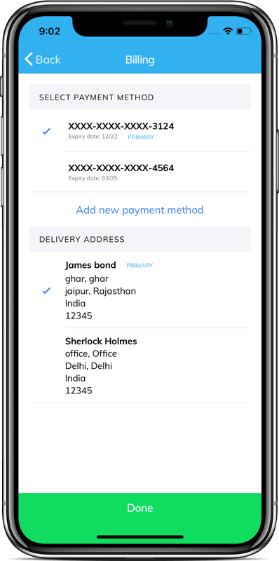 - Checkout page with payment options and addresses